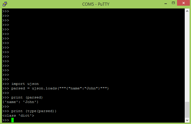 連接到 Python 提示符後,我們就可以開始編碼了。所以,我們需要做的第一件事就是導入 uJSON 模塊。只需鍵入下麵的表達式,然後按 Enter。
