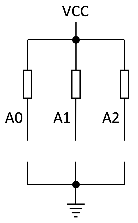 The address bits (A0 / A1 / A2) of the PCF8574A / PCF8574 are controlled by the A0 / A1 / A2 pins on the chip and it’s pulled high on the module by default. The schematic diagram is: