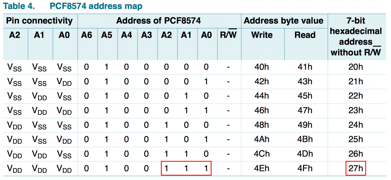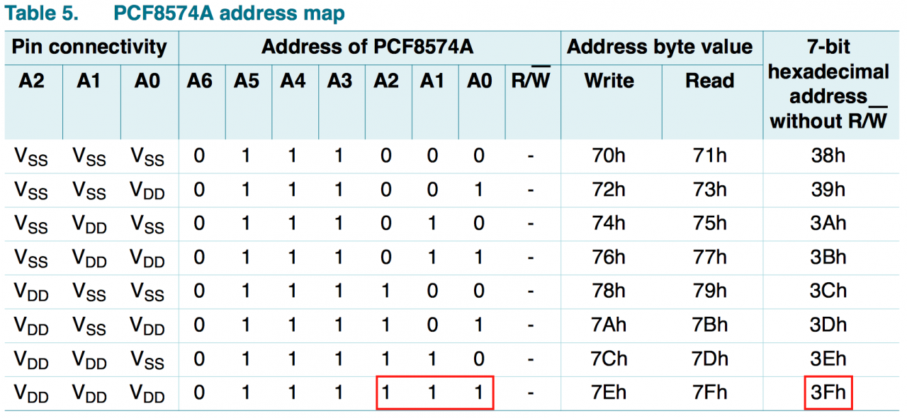 Therefore, if you mount a 0R resistor on the A0 pads of the module, for example, it will make the A0 bit to 0 and this changes the I2C address of this device from 0x3F to 0x3E on PCF8574A (or from 0x27 to 0x26 on PCF8574) according to the address map listed above. By following the same idea, you can modify the address bit A1 and A2 in the same way to customize your own I2C device address.