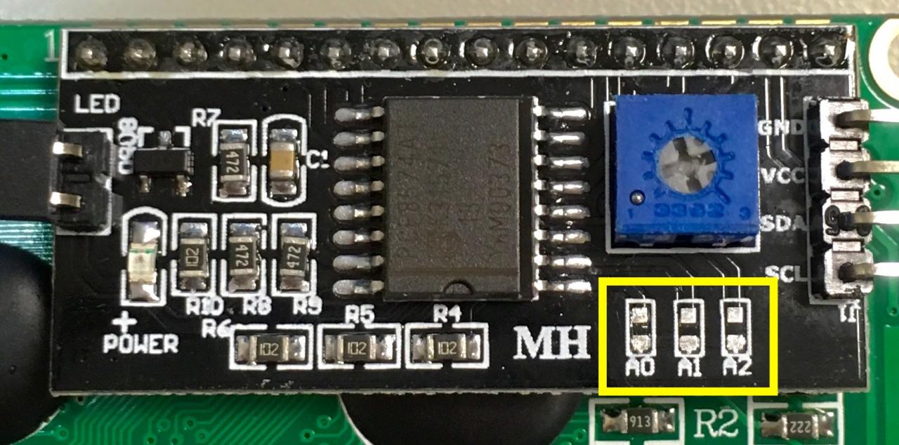 For the library, the 7-bit I2C address format is used so that’s why we assign 0x3F / 0x27 as the address for the device. However, the module also provides flexibilities for developers to customize the address to prevent from address collision on the same I2C bus. This is achieved by short-circuiting the A0 / A1 / A2 pads indicated by the yellow rectangle below: