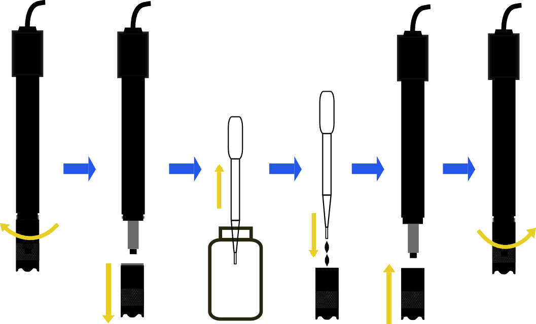 從探頭上擰下膜帽,用 0.5 mol/L NaOH 溶液填充約2/3 體積的膜帽。確保探頭相對於水平面處於垂直位置。小心地將蓋子擰回探頭。如果有一點溶液從蓋子溢出,以確保探頭完全充滿 NaOH 溶液,那就太好了。