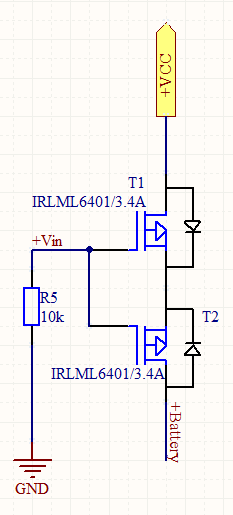 此處的電阻R5就是下拉電阻,圖中T1 T2為兩個PMOS管,這裡我們不深究,可以理解為一個開關,當+vin這一點電勢為0即Vin+沒有額外電源輸入的時候,該點電勢被電阻拉到0,這個開關打開,+VCC和+Battery接通。這個為常態。當+Vin有外接電源也就是有電勢的時候,由於電阻較大,對電勢基本沒有影響,該開關關斷,+VCC和+Battery斷開。