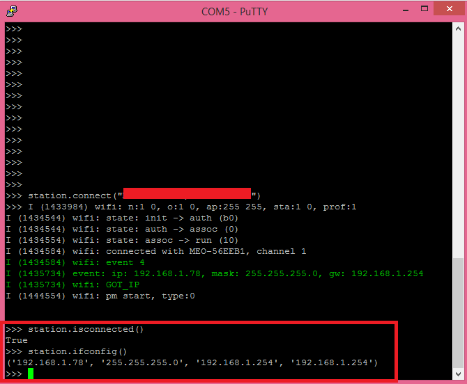 最後,我們將通過調用isconnected方法來確認連接,如果設備連接到 WiFi 網絡 [2],該方法返回 true。我們還將調用ifconfig方法,該方法返回 IP 地址、子網掩碼、網關和 DNS 作為輸出參數 [2]。