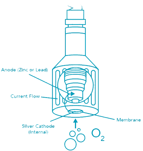 滲透膜允許樣品水中的氧氣擴散到傳感器中,並在陰極處被還原。這種化學反應產生電信號,電信號從陰極傳到陽極,然後進入溶解氧測量儀。在陰極消耗氧氣會在膜上產生一個壓力差,該壓力差會根據樣品中氧氣的分壓而變化。因此,隨著氧氣濃度的增加,分壓和擴散速率也會增加,儀器的電流也會成比例增加。