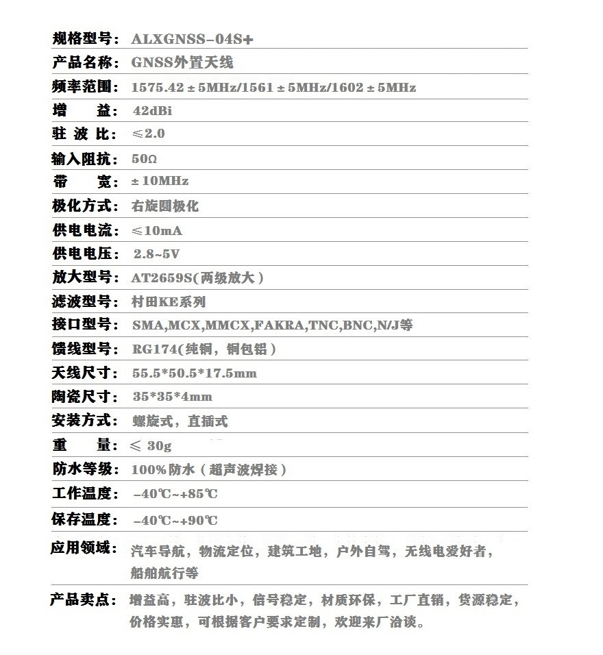 • GPS 外接天線 42db GLONASS / GNSS / Galileo 外接天線 SMA 直頭內針 3米長度