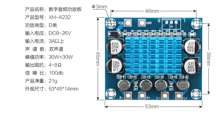 • XH-A232 高清數位音訊功放板mp3放大模組12V24V擴音板雙聲道30W